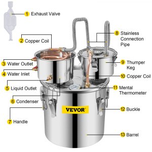 Condenser Keg: 7.9" x 4.3" / 20 x 11 cm,Capacity: 8 Gal / 30 L,Boiler Barrel: 13.8" x 13.8" / 35 x 35 cm,Material: Stainless Steel + Red Copper,Thumper Keg: 7" x 4" / 18 x 10 cm,Weight: 14.3 lbs / 6.5 kg